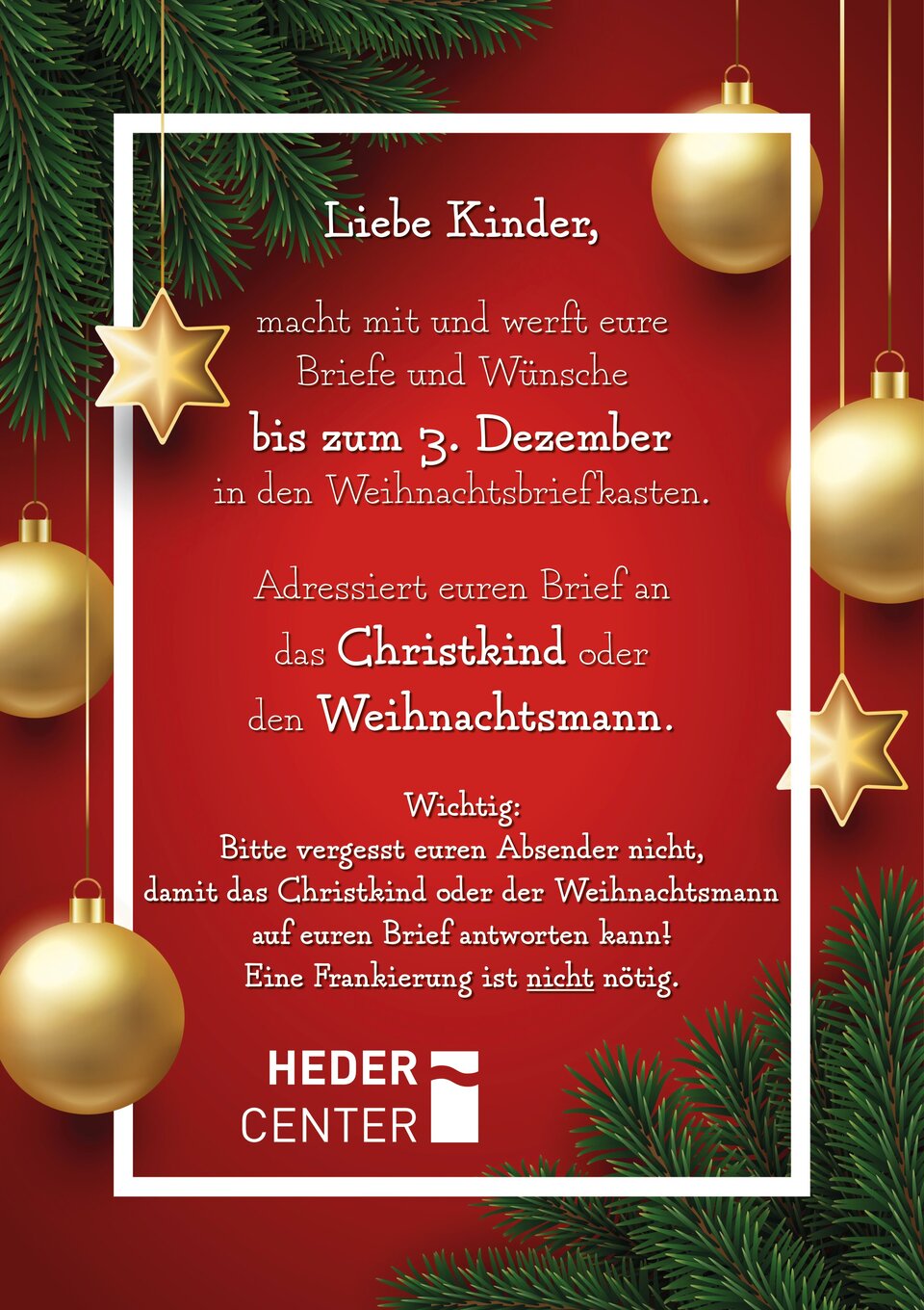 Bis zum 3. Dezember können die kleinen Besucher des Heder Centers wieder ihre Weihnachtsbriefe in den roten Briefkasten einwerfen. Der Briefkasten ist in der Ladenstraße, in der Nähe des Bankautomaten, platziert.